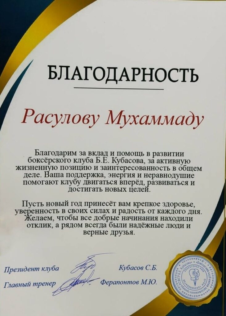 Наш студент второго курса специальности «Монтаж и техническое обслуживание судовых машин и механизмов» Расулов Мухаммаджон получил очередную награду — Благодарность за вклад в помощь в развитии клуба, где он занимается и популяризацию бокса 🏆